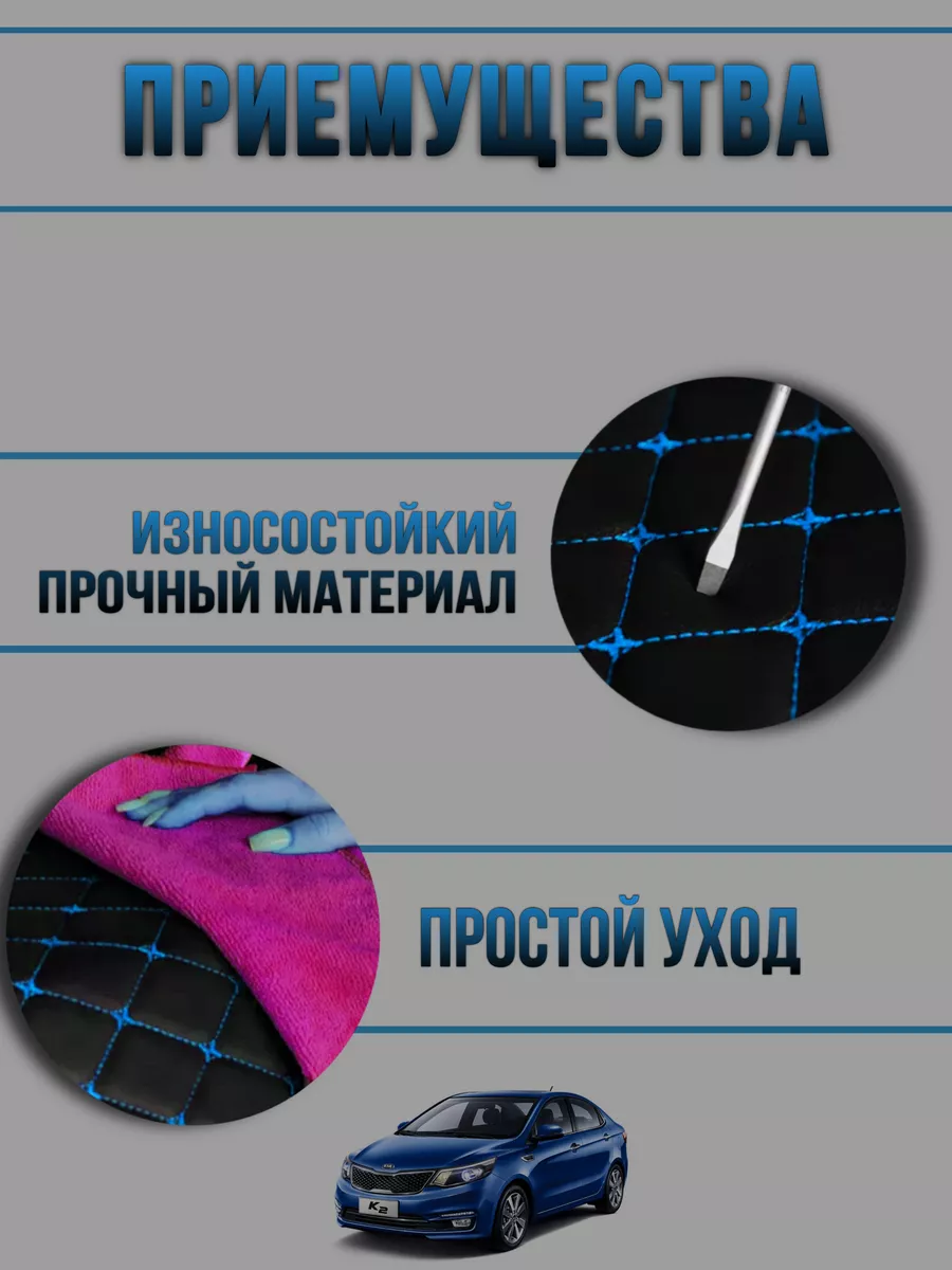 Чехлы на козырьки Kia Rio, Hyundai Solaris (2011-2017) синяя нить Бабочка изготовлены из качественных материалов, таких как искусственная кожа, поролон и спанбонд, что обеспечивает долговечность и надежность в использовании.